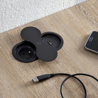 Встраиваемый блок с подпружиненной вращающейся металлической крышкой с черным матовым покрытием , 1 электрическая розетка 220В + Встраиваемый модуль для подзарядки всех типов USB устройств: мобильные телефоны, mp3-плееры, IPhone, IPad, видео и др. электронные устройства, силовой кабель 1м. с вилкой. None