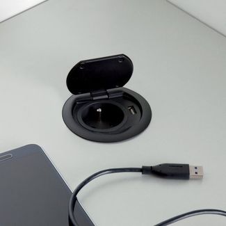 Встраиваемый в столешницу круглый блок из 1 розетки с заземлением и 1 порта USB 5В 1А для подзарядки мобильных телефонов, планшетов и т.п. с откидной крышкой. None