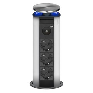 Выдвижная розетка EVOline Port Standart 931.00.313 с крышкой из нержавеющей стали и подсветкой от 6 голубых светодиодов и кнопкой выключения. Электрическая розетка с заземлением 16А/220В, с тремя розетками. None