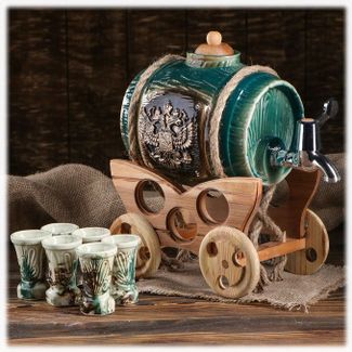Подарочный керамический бочонок для вина "Герб России" объёмом 2,5 литра с 6 рюмками - стильный подарок со вкусом, который порадует гостей своим привлекательным внешним видом и не раз соберёт в Вашем доме близких и друзей. Такой винный набор с художественной ручной росписью, идеально вписываясь в любой интерьер, способен украсить домашний бар ценителя этого благородного напитка.
