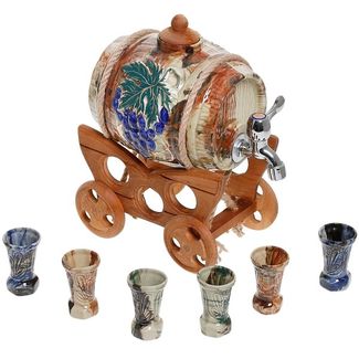 Подарочный керамический бочонок для вина "Мрамор" объёмом 2,5 литра с 6 рюмками - стильный подарок со вкусом, который порадует гостей своим привлекательным внешним видом и не раз соберёт в Вашем доме близких и друзей. Такой винный набор с художественной ручной росписью, идеально вписываясь в любой интерьер, способен украсить домашний бар ценителя этого благородного напитка.