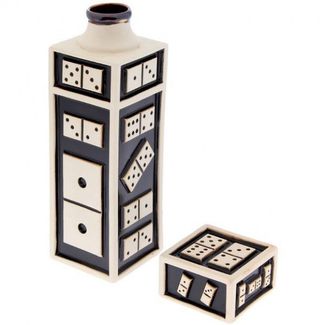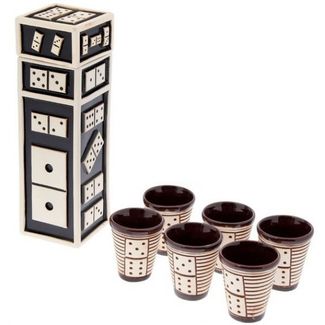 Набор "Домино" состоит из керамического сосуда для напитков объёмом 1,3 литра (27*8*8 см) и шести рюмок (7*6,5*6,5 см) по 75 мл, упакован в плёнку.