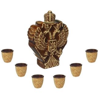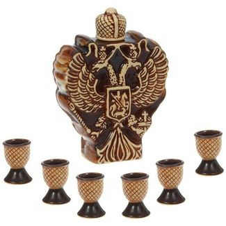 Набор "Герб" состоит из 0,7-литрового керамического сосуда для напитков (22*16*6 см) и шести рюмок (4,5*5*5 см), упакован в плёнку.