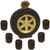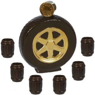 Набор "Колесо" состоит из литрового керамического сосуда для напитков (28*23*7 см) и шести рюмок (6,5*4,5*4,5 см) по 70 мл, упакован в плёнку.