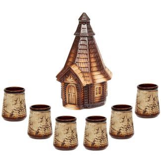 Набор "Колыба" состоит из 700 мл керамического сосуда для напитков (25*15*15 см) и шести рюмок (7*6*6 см), упакован в плёнку.
