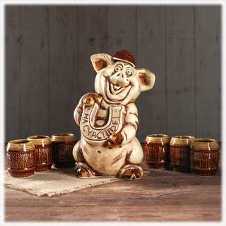 Набор "На счастье" состоит из литрового керамического сосуда для напитков (25*15*13 см) и шести рюмок (7*6*6 см) по 80 мл, упакован в плёнку.