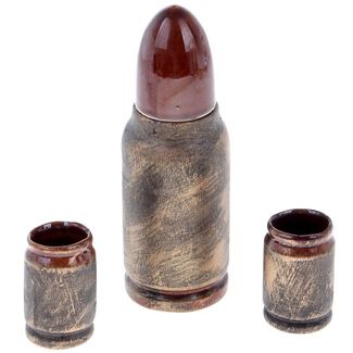Набор "Пуля" состоит из 300 мл керамического сосуда для напитков (19*6*6 см) и двух рюмок (7*4*4 см) по 50 мл, упакован в плёнку.