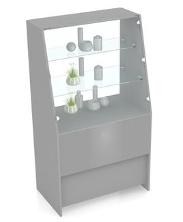 Фасадное наклонное стекло, толщиной 5мм с полировкой держится на хромированных держателях с винтовыми зажимами. В комплект прилавка входят две стеклянные полки. Высота подиума 55 см