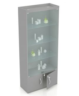 Состоит из четырех полок (три стеклянные, четвертая ЛДСП), две распашные дверцы, двойная подсветка (комплектуется двумя плафонами), замки на нижних и верхних дверцах. Задняя стенка - ДВПо. Высота накопителя 400мм. Также есть вариант витрины с зеркалом и со стеклом
