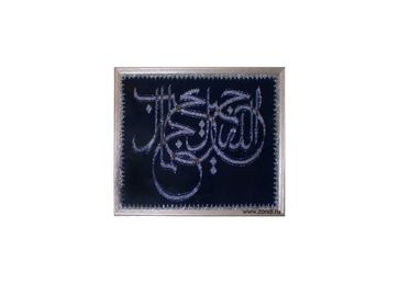 Каллиграфия: Каллиграфия - Бакый Урманче Материалы: Чешский бисер, серебряная нить, серебряная тесьма, синий бархат, стекло, деревянная рама Размеры: Размер – 44х35 см Дополнительно: На обратной стороне шамаиля – приклеен небольшой пакетик из органзы и серебряной тесьмы, куда вложен листок со значением шамаиля на татарском и русском языках. Из микробисера выложены инициалы автора работы.