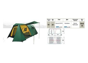 Большая и вместительная 10-ти местная палатка. Технические характеристики: Кол-во человек: 10 Ткань тента: Polyester 185T PU 4000 mm H2O Ткань палатки: Polyester RipStop Light Ткань дна: Polyethylene 4000 mm H2O Дуги: Steel 19 Вес: 24 кг Цвет: бежевый, зеленый None Есть доставка.