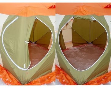 Палатка рыбака Нельма-Куб 1 отличается оригинальным дизайном. Оранжевый верх купола палатки виден издалека днем и хорошо замечен ночью (при горящем фонаре, лампе, свече). Прочный каркас из из дюралевого прутка диаметром 8 мм. обеспечивает долговечность и прочность палатки, а ткань Oxford 240T 2000PU с водоотталкивающей пропиткой необходимую защиту от ветра и осадков.Светлая ткань по центру стенки палатки обеспечивают отличное освещение внутри в снегопад и пасмурную погоду. Светоотражающие элементы на стенках издали видны в свете фар снегоходов и автомобилей даже при отсутствии внутренней подсветки. Четыре прочные петли оттяжки на стенах палатки и четыре петли по углам юбки позволяют надежно закрепить палатку на льду. Широкая замкнутая юбка полностью исключает поддув холодного воздуха снаружи.Углы палатки из немаркой ткани темных оттенков.Имеются несколько вентиляционных окон: два под куполом для выхода угарного газа, нижние для обеспечения конвекции воздуха. Два больших обзорных окна, закрывающиеся изнутри шторкой на молнии и снабженных отстегивающейся на липучке морозостойкой оконной пленкой. Смотрите нашу презентацию по палаткам рыбака Нельма-Куб 1 и 2 в формате PDF! None