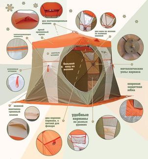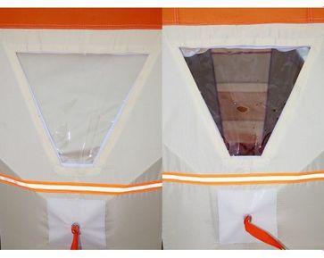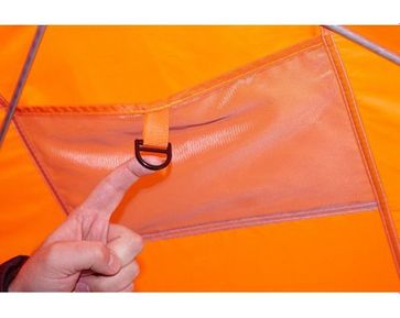 Палатка рыбака Нельма-Куб 2 отличается оригинальным дизайном. Оранжевый верх купола палатки виден издалека днем и хорошо замечен ночью (при горящем фонаре, лампе, свече). Прочный каркас из из дюралевого прутка диаметром 8 мм. обеспечивает долговечность и прочность палатки, а ткань Oxford 240T 2000PU с водоотталкивающей пропиткой необходимую защиту от ветра и осадков.Светлая ткань по центру стенки палатки обеспечивают отличное освещение внутри в снегопад и пасмурную погоду. Светоотражающие элементы на стенках издали видны в свете фар снегоходов и автомобилей даже при отсутствии внутренней подсветки. Четыре прочные петли оттяжки на стенах палатки и четыре петли по углам юбки позволяют надежно закрепить палатку на льду. Широкая замкнутая юбка полностью исключает поддув холодного воздуха снаружи.Углы палатки из немаркой ткани темных оттенков.Имеются несколько вентиляционных окон: два под куполом для выхода угарного газа, нижние для обеспечения конвекции воздуха. Два больших обзорных окна, закрывающиеся изнутри шторкой на молнии и снабженных отстегивающейся на липучке морозостойкой оконной пленкой. Смотрите нашу презентацию по палаткам рыбака Нельма-Куб 1 и 2 в формате PDF! None