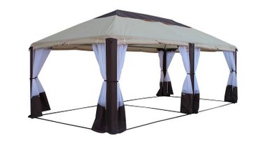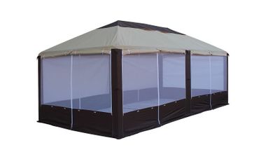 В этом шатре площадью 18 кв. м. комфортно разместится 20 человек. Шатер Митек "Пикник-Элит" может использоваться как для коллективного отдыха на природе, так и на приусадебном участке. Отлично подойдёт в качестве беседки, шатра для барбекю или летней кухни. Это далеко не все варианты использования шатра. Например, Вы можете использовать его для торжественных мероприятий (свадеб, дней рождения, семейных праздников, банкетов, фуршетов, и других мероприятий). Шатер Митек "Пикник-Элит" будет роскошным украшением Вашего приусадебного участка, а если Вы решите разместить его на каком-либо мероприятии - подчеркнёт индивидуальность Вашего торжества! Тент шатра выполнен из полиэфирной ткани oxford 300D PU 2000 с водоотталкивающей пропиткой (водостойкостью 2000 мм водяного столба), устойчивой к воздействию солнечных лучей. Швы крыши тента проклеены. В верхней части крыши имеется вентиляционный клапан-вытяжка, снабженный антимоскитной сеткой от насекомых и защитным козырьком. Благодаря этому внутри шатра всегда будет свежий воздух, но не будет проблем с насекомыми и осадками! Тент крепится к каркасу при помощи стропы с пряжкой и липучек. Это позволяет осуществить хорошую натяжку тента, что очень важно при ветре и дожде. Глухие стенки сверху пришиты к тенту и крепятся к ножкам при помощи застежек-молний (при необходимости Вы можете их поднять) Стенки с антимоскитной сеткой пришиты к стойкам и соединены между собой разъемной молнией. Сверху стенки с сеткой крепятся к поперечным трубкам при помощи петель, что позволяет расстегивать и раздвигать стенки в стороны. Отличительной особенностью шатра является наличие раздвижных москитных стенок. Тент имеет восемь прочных петель-оттяжек, для дополнительной жесткой фиксации на местности. Защитная замкнутая юбка с низу тента исключает поддув холодного воздуха снаружи и затекания воды. Каркас нового шатра выполнен из стальной трубы диаметром 25 мм с усиленными вертикальными стойками и узлами из трубы диаметром 28 мм, как и в предыдущей