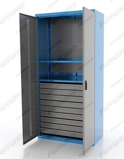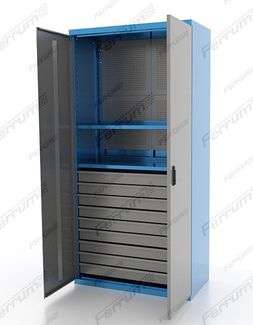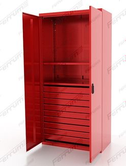 ригельная система запирания с тягами;возможность крепления пластиковых ящиков на дверь шкафа;1 большая перфорированная панель для удобства крепления навески на стенку шкафа;2 большие полки;распределенная нагрузка на полку 80 кг.;9 больших ящиов;распределенная нагрузка на полку 30 кг.;полки крепятся под углом от 0-30 градусов на разной высоте с шагом 50 мм;петли позволяют раскрывать створки на угол до 180 градусов;порошковая эпоксидно-полиэфирной покраска;вес - 170 кг.поставляется в разобранном виде