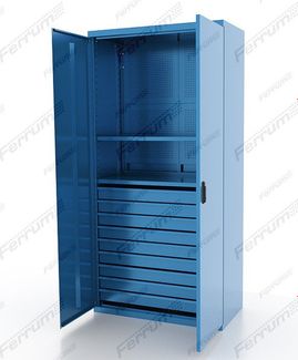 Инструментальный шкаф 03.3092 предназначен для размещения оснастки, приспособлений и инструмента на рабочих местах промышленных предприятий. Шкаф обеспечивает надежное хранение благодаря ригельной системе запирания и изготовлению из высококачественной листовой стали. Поставляются в разобранном виде упакованные в стрейч пленку и пятислойный гофрокартон на индивидуальном поддоне Основные характеристики:
