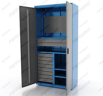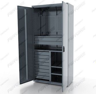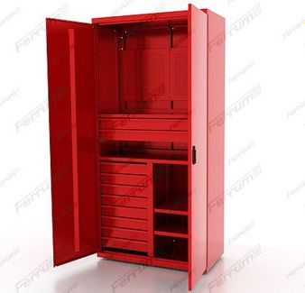 Инструментальный шкаф 03.3204 предназначен для размещения оснастки, приспособлений и инструмента на рабочих местах промышленных предприятий. Шкаф обеспечивает надежное хранение благодаря ригельной системе запирания и изготовлению из высококачественной листовой стали. Поставляются в разобранном виде упакованные в стрейч пленку и пятислойный гофрокартон на индивидуальном поддоне Основные характеристики: