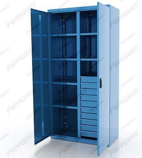 ригельная система запирания с тягами;возможность крепления пластиковых ящиков на дверь шкафа;Т-образная перегородка делит шкаф на 2 части;6 малых полок;распределенная нагрузка на полку 80 кг.;10 малых ящиков;распределенная нагрузка на полку 30 кг.;полки крепятся под углом от 0-30 градусов на разной высоте с шагом 50 мм;петли позволяют раскрывать створки на угол до 180 градусов;порошковая эпоксидно-полиэфирной покраска;вес - 83 кг.поставляется в разобранном виде