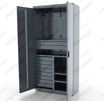 Инструментальный шкаф 03.3106 предназначен для размещения оснастки, приспособлений и инструмента на рабочих местах промышленных предприятий. Шкаф обеспечивает надежное хранение благодаря ригельной системе запирания и изготовлению из высококачественной листовой стали. Поставляются в разобранном виде упакованные в стрейч пленку и пятислойный гофрокартон на индивидуальном поддоне Основные характеристики: