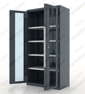 оснащены надежным замком-бабочкой с ригельной системой запирания;петли, приваренные к корпусу, позволяющие открывать двери шкафа до 180 градусов;двери шкафа оснащены алюминиевыми ручками с возможность установки информационной вставки и защитной пленкой. Торцы ручек закрыты пластиковыми заглушкамикреплениями под рым-болты для транспортировки шкафа кран балкой (Рым-болты в комплект не входят Арт. 13.904)4 оцинкованные полки: габаритный размер полки (ШхГхВ) - 950 х 440 х 40h ммравномерно распределенная нагрузка на полку – 150 кг.шаг перестановки полок - 50 мм.тип покрытия - порошковое эпоксидно-полиэфирное с высокой механической, атмосферной стойкостью;цвет, RAL – 7016; 7016/3000; 7016/5015стеклянные двери