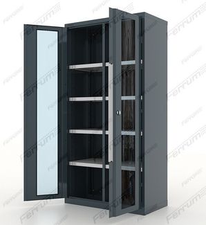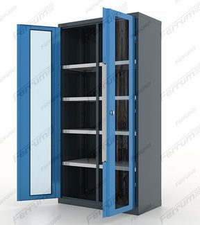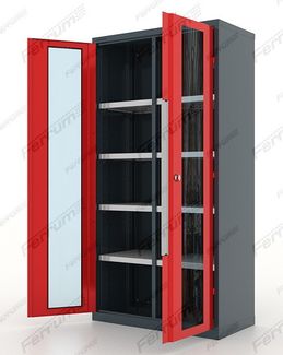 оснащены надежным замком-бабочкой с ригельной системой запирания;петли, приваренные к корпусу, позволяющие открывать двери шкафа до 180 градусов;двери шкафа оснащены алюминиевыми ручками с возможность установки информационной вставки и защитной пленкой. Торцы ручек закрыты пластиковыми заглушкамикреплениями под рым-болты для транспортировки шкафа кран балкой (Рым-болты в комплект не входят Арт. 13.904)перегородка - 1 шт.8 малых оцинкованных полки: габаритный размер полки (ШхГхВ) - 460 х 440 х 40h ммравномерно распределенная нагрузка на полку – 100 кг.шаг перестановки полок - 50 мм.стеклянные двери;тип покрытия - порошковое эпоксидно-полиэфирное с высокой механической, атмосферной стойкостью;цвет, RAL – 7016; 7016/3000; 7016/5015