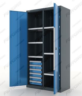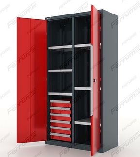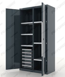 оснащены надежным замком-бабочкой с ригельной системой запирания;петли, приваренные к корпусу, позволяющие открывать двери шкафа до 180 градусов;двери шкафа оснащены алюминиевыми ручками с возможность установки информационной вставки и защитной пленкой. Торцы ручек закрыты пластиковыми заглушкамикреплениями под рым-болты для транспортировки шкафа кран балкой (Рым-болты в комплект не входят Арт. 13.904)перегородка - 1 шт.6 оцинкованных полок: габаритный размер полки (ШхГхВ) - 460 х 440 х 40 ммравномерно распределенная нагрузка на полку – 100 кг.шаг перестановки полок - 50 мм.блок из 3 ящиков, устанавливается при наличии вертикальной перегородки: внутренний размер ящика (ШхГхВ) - 355х411х88 мм., нагрузка на ящик – 50 кг.ручки ящиков - алюминиевые профиля с возможность установки информационной вставки и защитной пленкойтип покрытия - порошковое эпоксидно-полиэфирное с высокой механической, атмосферной стойкостью;цвет, RAL – 7016; 7016/3000; 7016/5015