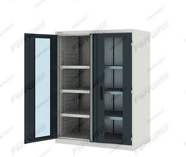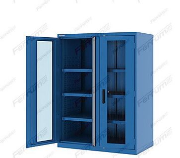 покрытие порошковой покраской RAL 7001/7016, 5015;текстура краски - глянец;допустимая равно-распределенная нагрузка - 1500 кг.;тип дверей: стеклянные;нагрузка на полку: 200 кг.;надежный замок-бабочка;петли, позволяющие раскрывать створки на угол до 180 градусов;шаг перестановки полки 50 мм.;полка 957х513 мм -3 шт.