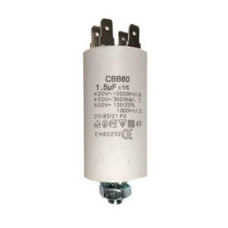 Артикул: х60015Пусковой конденсатор серия СВВ60. Емкость: 1,5 мФ (uF). Напряжение: 450В. Размер 57*30 мм. Имеет 4 контакта. Резьба М8 с шайбой и гайкой. None
