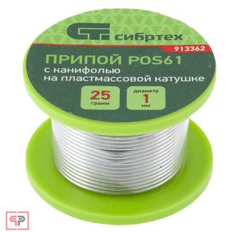 - СИБРТЕХ Припой с канифолью, D 1 мм, 25 г, POS61, на пластмассовой катушке Сибртех в каталоге Затирка, прочие материалы в России;