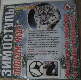 Незаменимое приспособление из морозостойкой резины с металлическими шипами. Предназначены для предотвращения скольжения обуви во время пеших прогулок по обледеневшим поверхностям и плотному снегу, для занятий зимними видами спорта. Легко и надежно крепятся поверх любой обуви с 35 по 45 размер. None