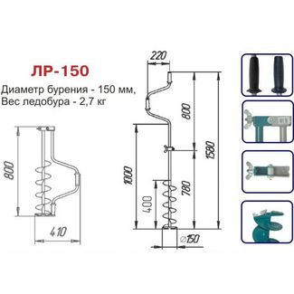 Выпуск ледорубов с диаметром бурения 150 мм имеет целью перекрыть пустующую нишу в промежутке между диаметрами 130 и 180 мм. В тех случаях, когда необходим увеличенный диаметр лунки, а применение ледобура на 180 еще нецелесообразно, незаменимым инструментом рыболова станет стопятидесятый. Главной отличительной чертой ледобуров ЛР-150 является уникальная конструкция ножей – две ступеньки с прорезями и выверенные углы режущих плоскостей обеспечивают легкий скол льда и его выведение из зоны резания. Благодаря этому, по скорости бурения ЛР-150 может легко соперничать с ледобурами диаметром 130 мм, лишь немного превосходя ЛР-130 по прилагаемым усилиям. Межцентровое расстояние креплений ножей увеличено для их большей жесткости и отличается от ледобуров других диаметров производства ЗАО ТОНАР плюс. Диаметр бурения – 150 мм, глубина бурения – 1000 мм. Вращение ледобура – левое (против часовой стрелки), верхняя ручка совпадает с осью ледобура . None