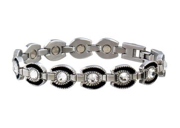 Изысканный браслет Sabona of London со звеньями в форме подковок, черного цвета, и сверкающими фианитами, поможет вам не только привлечь удачу и успех, но и поддержать отличное самочувствие: в каждое звено этого браслета, выполненного из ювелирной стали, встроен самариевый магнит силой 1200 гаусс. Под воздействием слабого магнитного поля происходит улучшение кровообращения, повышается насыщаемость кислородом и ускоряется процесс переноса питательных веществ. Принцип действия магнитного браслета основан на прямом воздействии на кровеносные сосуды и активные точки в области запястья, там, где вены и артерии находятся очень близко к поверхности тела, а также сосредоточено большое количество биологически активных зон. Покупая браслет Сабона Вы приобретаете изделие высочайшего европейского качества. Это украшение будет радовать Вас долгие годы. Большой выбор размеров позволит Вам подобрать браслет максимально удобный для ежедневного ношения. Свяжитесь с нашим консультантом и он поможет Вам подобрать нужный размер выбранного Вами браслета. БЕСПЛАТНАЯ ДОСТАВКА