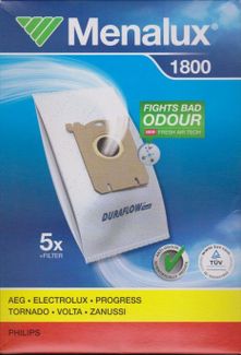 Мешки синтетические Menalux 1800 для пылесосов AEG, ELECTROLUX, ZANUSSI, PHILIPS и др. с типом оригинала S-bag. Нетканые пылесборники Menalux увеличивают срок службы Вашего пылесоса до 50%, за счет высокого уровня фильтрации. Многослойный синтетический материал является более прочным и устойчивым к влаге. В комплект Menalux 1800 входит 5 синтетических пылесборников и 1 моторный фильтр. None Есть доставка.