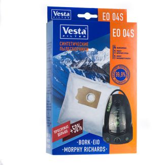 Синтетические пылесборники VESTA FILTER EO 04 S для пылесосов EIO, BORK, THOMAS. Произведены из синтетического микроволокна, обладают высокоэффективным качеством фильтрации в 99.9 % (0.3 микрон), обеспечивают очистку воздуха выходящего из пылесоса. Благодаря синтетическому материалу мешки VESTA FILTER EO 04 S не боятся воды и острых предметов, сохраняют мощность пылесоса при заполнении, вмещают в себя больше содержимого чем мешки из бумаги. В комплектацию входят 4 пылесборника , 1 фильтр моторного отсека и 1 фильтр выходящего воздуха. None Есть доставка.