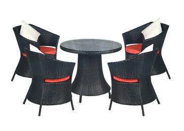 В составе комплекта можно выделить такие элементы, как круглый стол, столешница которого защищена прочным каленым стеклом, четыре удобные кресла с яркими разноцветными подушками, уже входящими в состав комплекта.В качестве основы мебельного комплекта для дачи применяется металлическая оправа, обеспечивающая надежность, устойчивость и продолжительный период использования данной мебели, а плетение из искуственного ротанга используется в виде искусного дополнения, придавая интерьеру столь непринужденный стиль и создавая неповторимую уютную атмосферу. Таким образом, данный комплект является