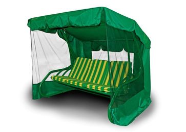 Полимерное покрытие, которым окрашено изделие специально предназначено для использования в агрессивной уличной среде. Сверху садовых качелей на металлической раме натянут тент,