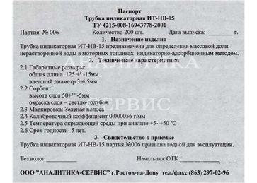 Трубка индикаторная ИТ-НВ-15 предназначена для определения массовой доли нерастворенной воды в моторных топливах.
