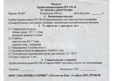 Трубка индикаторная ИТ-СВ-10 предназначена для определения суммарной доли воды в топливах.
