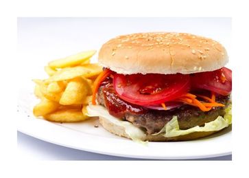 баранина или говядина, булка,салат, огурец, лук, помидор, соус, фри