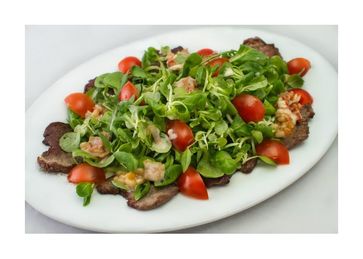 Обжаренная говяжья вырезка, микс салатов, помидор черри, заправленные соусом из сливок, бекона и кедровыми орешками