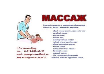 Опытный специалист с медицинским образованием предлагает массаж, мужчинам и женщинам:- общий классический массаж всего тела- лечебный массаж- массаж спины- массаж лица- лимфодренажный массаж- тайский классический массаж- общая мануальная терапия- массаж Хамам- антицеллюлитный массаж- баночный массаж- медовый массаж- SPA процедуры (обертывания)Возможен выезд на территорию клента.Контакты: www.massage-maxs.ucoz.ru, т.8-919-897-67-92, Максим, г.Ростов-н/Д.