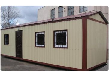 Строительные бытовки изготавливаются из стандартных блок-контейнеров, стандартные размеры 6000×3000х2500 мм. Материал стен – профлист, металлосайдинг или сэндвич-панель. Крыша выполнена из стального листа, толщиной 2 мм., утеплитель 100 мм.