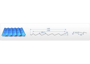 Металлочерепица марки «Monterrey» на данный момент является наиболее ходовым продуктом в частном котеджном строительстве. Высокий спрос обусловлен сравнительно невысокой стоимостью (дешевле профиля С21) и при этом оригинальным внешним видом. По техническим характеристикам черепица уступает профилю С21, также при монтаже обрешётки необходимо учитывать, что крепление листа черепицы производится в строго определённом месте (низ волны, в основании ступени), значит и доска должна крепится на заранее просчитанном месте. Рекомендуется делать сплошную обрешётку. Особое внимание нужно обратить на толщину. Стандартная черепица должна быть не тоньше 0,5 мм. При покупке 0,45 или даже 0,4 мм. Вы сэкономите, примерно, 15-18 руб. с м2, но эта экономия для нашего климатического пояса может обернуться, как говорится «себе дороже». Габаритная ширина листа металлочерепицы - 1185 мм., монтажная 1100 мм. Максимальная высота гофры – 39 мм., поперечный шаг – 350 мм.