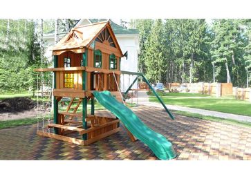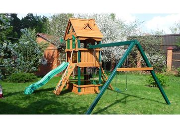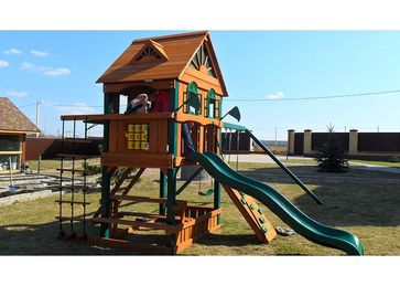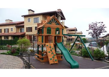 Игровой комплекс «Солнечный луч» с большим деревянным фортом оснащен рулем, телескопом и перископом, флажками и колокольчиком. Дерево, из которого изготовлена детская площадка, пропитано специальным составом, защищающим от гниения, солнечных лучей и насекомых.