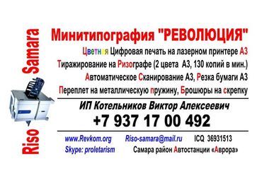 Визитки в Самаре, изготовление визитных карточек Мини-типография "Революция"Оперативная полиграфия в СамареТиражирование на ризографе в Самаре А4, А3, 2 цвета черный и красныйЦветная Цифровая печать на лазерном принтере в Самаре -А4, А3Автоматическое сканирование А4, А3 -78 шт в мин. в СамареБрошюровка на скрепкуПереплет на металлическую пружинуhttp://www.revkom.org/Тел: +7 937 1700 492riso-samara@mail.ruICQ# 36931513В районе Автостанции «Аврора»Skype: proletarism