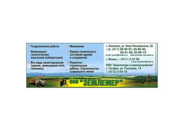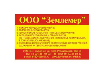 ООО «Землемер» г. Смоленск, тел: (4812) 64-60-40, г.Гагарин, (48131) 35419, г. Вязьма , (48131) 23760. Строительство коттеджей, домов по всем эффективным современным технологиям из экологически чистых материалов. Строительные ремонтно-отделочные работы любой сложности. Строительство инженерных сетей. Помощь при выборе, покупке, продаже и оформлении земельного участка. Межевание с GPS RTK. Судебная землеустроительная экспертиза. Топографическая съемка. Геоподоснова. Генеральные планы и схемы планировки земельных участков. Инженерные геологические изыскания. Статическое зондирование. Лабораторные исследования грунтов. Геология под коттедж. Проектирование гражданских и промышленных сооружений, инженерных сетей. Обследование технического состояния зданий и сооружений, согласование перепланировок. Реставрационные работы. Устройство буронабивных свай. Полный комплекс услуг по разработке проектной и изыскательской документации, строительству и ремонтно-отделочным работам. Проектирование и строительство парковых, садовых прудов, искусственных водоемов, плотин. Все виды работ и услуг природоохранного назначения.
