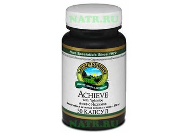Achieve with Yohimbe (Продукт для мужчин!!!) --Усиливает половое влечение --Обеспечивает питательную поддержку предстательной железе --Поддерживает нормальную работу мочеполовой и репродуктивной системы у мужчин --Гармонизирует нервную и эндокринную системы --Повышает жизненный тонус Биологически активная добавка к пище Achieve with Yohimbe от NSP предназначена для стимуляции половой потенции у мужчин и усиления репродуктивной способности. Добавка представляет собой научно обоснованную комбинацию лекарственных растений, повышающих либидо, энергию, выносливость и укрепляющих здоровье мужчин.Действующее начало экстракта коры дерева йохимбе - алкалоид йохимбин. При употреблении средств с йохимбином происходит прилив крови к органам малого таза, усиливается половая активность. Одновременно происходит стимуляция деятельности нервных узлов спинного мозга, которые управляют эрекцией.Плоды карликовой пальмы (со пальметто) при регулярном приеме стимулируют работу гормональной системы, в том числе половых желез, увеличивают выделение спермы, повышают половое влечение и оказывают противовоспалительное действие при инфекциях мочеполовой системы, препятствуют увеличению простаты, способствуют укреплению организма после болезней.Элеутерококк (сибирский женьшень) является прекрасным стимулятором и адаптогеном. На протяжении столетий используется для продления жизни, сохранения мужественности, улучшения и регулирования гормонального баланса, укрепления сердечной и нервной систем, повышения сопротивляемости болезням. Применяется при импотенции.Дамиана известна своим свойством снимать напряжение при беспокойстве, нервозности, слабости, депрессии, истощении, вызванных эмоциональным или сексуальным напряжением. При регулярном приеме