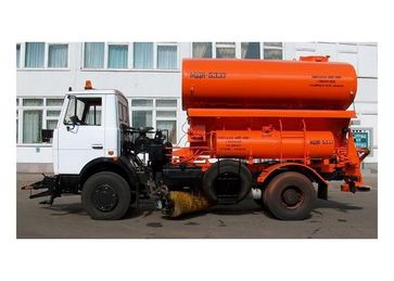 Оборудование: солепескоразбрасывающее (без тента или с тентом), система увлажнения соли для солепескоразбрасывающего оборудования, распределитель жидких противогололёдных реагентов, автоматизированная цифровая система управления распределением противогололёдных материалов – АЦСУ, поливо-моечное оборудование с центробежным насосным агрегатом и поворотными соплами, высоконапорное поливо-моечное оборудование с передней поворотной гребёнкой с форсунками, отвал поворотный, отвал поворотный комбинированный, щётка средняя, щётка для мойки ограждений. Машина комплектуется любым вышеперечисленным оборудованием по желанию заказчика.Базовое шасси МАЗ-5337А2* (4х2)ДвигательМодель ЯМЗ-6563.10Тип дизельныйМощность, кВт (л.с.) 167 (227)Технические характеристикиВместимость кузова для песка (соли), м3 6,3Вместимость баков для солевого раствора, м3 1,35 (1,8)Вместимость цистерны для воды или жидких противогололёдных реагентов, м3 8,0Плотность посыпки пескосоляной смесью/солью, г/м2 50 - 500 / 5 - 60Плотность распределения жидких противогололёдных реагентов, мл/м2 30 - 150Давление воды, МПа :- с центробежным насосом и соплами 1,0- с высоконапорным насосом и "гребёнкой" до 5,0Ширина рабочей зоны, м :- при распределении пескосоляной смеси 2 - 10- при распределении жидких реагентов 2 - 9- при очистке поворотным отвалом 2,6 - 3- при очистке поворотным комбинированным отвалом 2,6 - 3- при подметании средней щёткой 2,4 (2,6)- при мойке щёткой для ограждений 0,5- при мойке поворотными соплами до 10- при поливке поворотными соплами до 20- при высоконапорной мойке "гребёнкой" 2,5-4 *Возможно изготовление на базовом шасси МАЗ-533702**по желанию заказчика