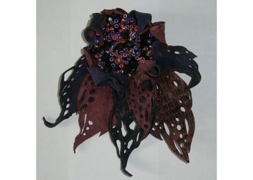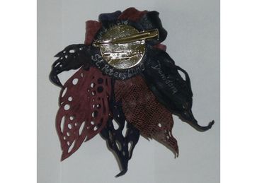 Брошь выполнена с двумя застежками. Прекрасный аксессуар как для торжественных случаев, так и в повседневности. Изготовлена из натуральной кожи и чешского бисера. Можно выполнить с любой застежкой: застежка-брошь, заколка-автомат, заколка-зажим, подвязки на сумку или ремень. Размер 14 см.