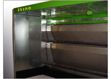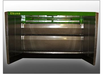 Конструкция окрасочной камеры предусматривает многокаскадную очистку отработанного носителя (воздуха) с помощью водяных завес, лабиринтных отсекателей и материалов тонкой финишной фильтрации, что позволяет достичь уровня очистки до 99%. На степень очистки от мелкодисперсной фракции распыляемых красок существенное значение оказывает количество водяных завес, поэтому камеры могут изготавливаться одно, двух и трехкаскадными, а также с боковыми водяными завесами и активными полами. Основным преимуществом окрасочной камеры нашей фирмы является наличие высокотехнологичных, регулируемых по уровню водяных экранов, выполненных из нержавеющей стали – это делает нашу камеру практически неизнашиваемой. С экранов из нержавеющей стали (в отличие от экранов из оцинкованной стали), не снимается поверхностный слой цинка при длительном воздействии проходящих по ним водных потоков с абразивной взвесью (засохшие частицы краски), что со временем приводит к появлению коррозии и нарушению гидродинамики. Поверхность водяных экранов из нержавеющей стали при попадании и засыхании на ней лакокрасочных материалов (при неосторожном обращении с покрасочным оборудованием) допустимо чистить механическим путем. Камеры с водяной завесой рассчитаны на высокую нагрузку и производительность, не требуя при этом существенных затрат на фильтровочные материалы. Технические характеристики ФВЗ-2 (Фильтр с 2 водяными завесами)